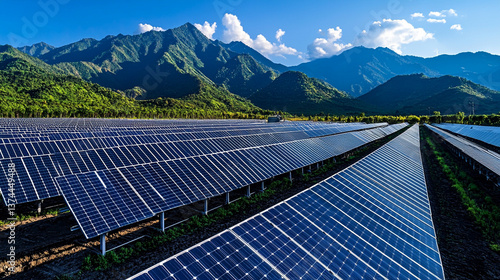 expansive view of solar energy site with rows of solar panels surrounded by lush mountains, showcasing renewable energy and nature beauty