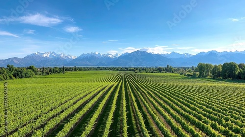 Expansive Vineyard Landscape Surrounded by Majestic Mountains and Clear Blue Sky, Showcasing Rows of Lush Green Grapevines Under Bright Sunlight