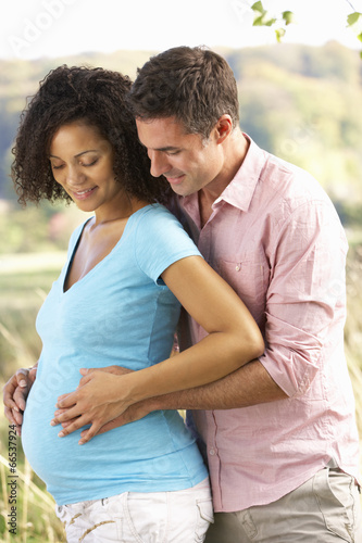 couple, expectant, outdoors, countryside, people, adult, caucasian, african american, mixed, male, man, female, woman, husband, wife, 30s, 30s, 20s, 20s, outside, field, country, rural, walk, stroll, standing, relaxed, relaxing, leisure, casual attire, pregnant, expecting, baby, bump, pregnancy, maternity, holding, anticipating, anticipation, excited, excitement, proud, feeling, kick, kicking, hugging, portrait, vertical