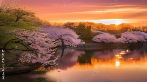 Experience the beauty of cherry blossoms bathed in warm sunset light, crafting a stunning springtime tableau in the golden hour.