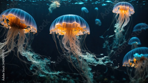 Experience the ethereal beauty of a bioluminescent jellyfish as it glows in the depths of a dark underwater world