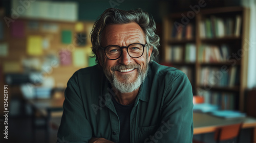Experienced Caucasian Male Teacher with Glasses Smiling in a Cozy Library or Classroom, Surrounded by Bookshelves, Creating a Warm and Intellectual Learning Atmosphere