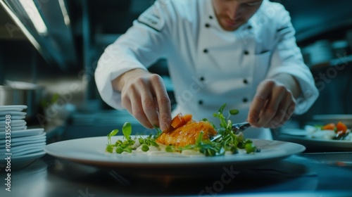 Experienced chef garnishing a beautifully plated gourmet dish in a high-end restaurant. Great for culinary, food, and hospitality industries.