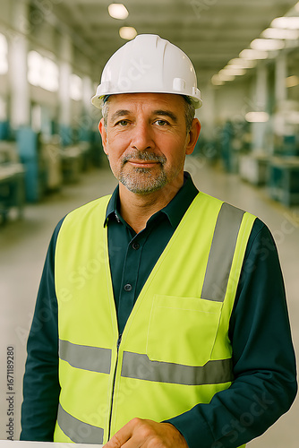 Experienced construction worker in safety vest and hard hat smiles confidently in modern facility