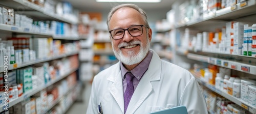 apothecary, man, pharmacy, health care, medicals, medicine, drug, store, professional, happy, smile, senior, clipboard, aisle, shelf, product, medication, health, wellness, retail, pharmaceutical, dispenser, chemist, men at work, employment, service, care, expertise, advice, consultation, treatment, prescription, counter, background, interior, blurred, bright, cheerful