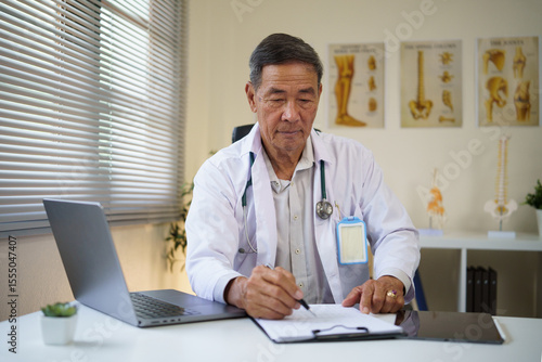 Experienced senior doctor documenting patient information in a modern medical office.