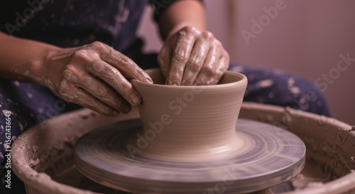 Expert hands skillfully molding natural clay on a rotating pottery wheel