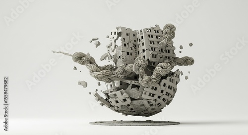 shape, realistic, grey, surreal, texture, light, abstract, digital, art, crumbling, modern, concept, illustration, three-dimensional, composition, chaos, explosion, creative, design, form, knot, sphere, model, element, thread, sculpture, destruction, background, detail, representation, architecture, structure, rendering