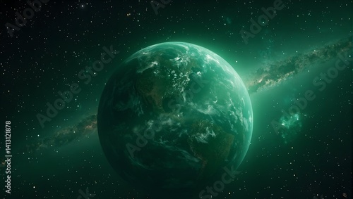 Explore a stunning alien world with swirling storms and reflective seas set against a backdrop of twinkling stars in a distant solar system
