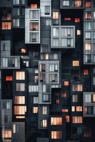 grid, block, residential, design, concrete, geometric, elevation, perspective, metropolis, contemporary, dusk, facades, pattern, exterior, modern, window, structure, construction, dwelling, city landscape, symmetry, aesthetic, architecture, urban