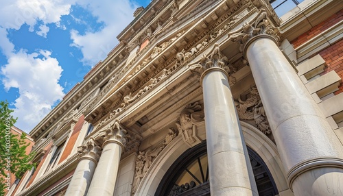 Explore the stunning exterior of historic museum in the United States. This architectural beauty features intricate stone work and imposing columns under vibrant sky.