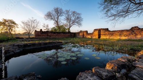 Exploring ancient ruins by a serene pond historical site outdoor tranquil morning nature's beauty