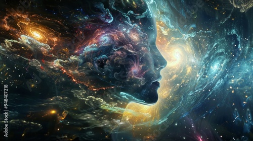 Exploring the continuum of consciousness through the cosmic landscape, showcasing a human silhouette intertwined with galaxies at night
