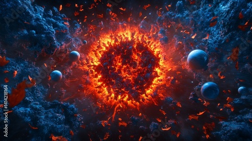 Explosive cosmic scene depicting a fiery supernova surrounded by swirling planetary bodies and colorful debris in a vibrant universe