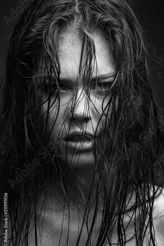 Expressive black white portrait of a young attractive girl with wet dark hair