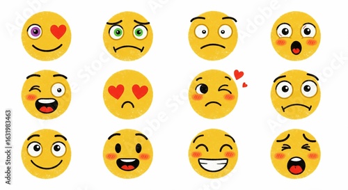 emoticon, face, yellow, expression, emotion, happy, sad, angry, surprised, love, wink, heart, cartoon, illustration, graphic, design, social, media, communication, digital, art, drawing, hand-drawn, isolated, white, background, cheerful, playful, fun, cute, character, symbol, message, online, chat, cyberspace, web, icon, smiley, feeling, mood, reaction, positive, negative, upset, excited, joyful, lovely