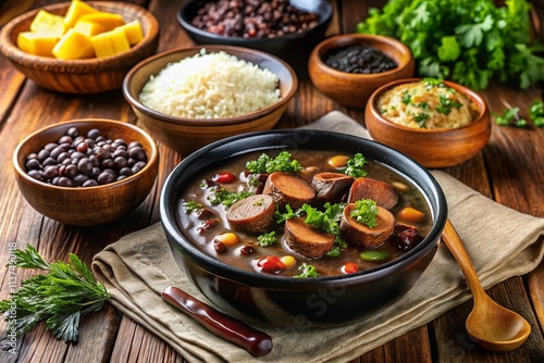 Exquisite Brazilian Feijoada Soup with Black Beans, Pork, Sausage, and Spices, Served with Rice and Farofa in a Warm, Rich Broth Perfect for Urban Exploration Photography