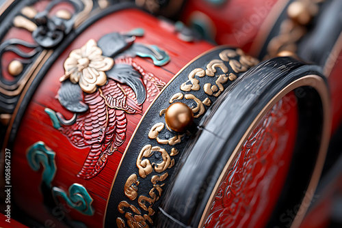 drum, chinese, culture, red, gold, intricate, craftsmanship, detail, art, tradition, design, heritage, musical, festival, celebration, decoration, beauty, pattern, ornamentation, vibrant, rythm, sound, performance, symbolism, folklore, aesthetic, ethnic, hand-made, creativity, elegance, texture, mastery, historical, iconic, unique, ornate, ceremonial, richness