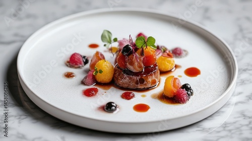 Exquisite dessert presentation with vibrant fruits and sauces on marble table