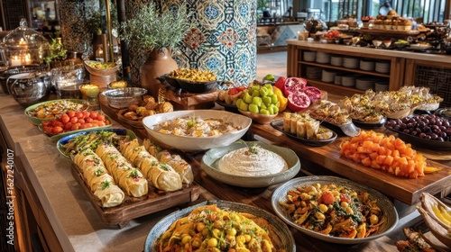 Exquisite Display of Fresh Fruits, Colorful Salads, and Traditional Dishes at a Lavish Buffet Table in a Modern Dining Space