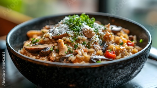 mushroom, risotto, creamy, herb, parmesan, dish, bowl, dinner, warm, inviting, garnish, elegant, comfort, favor, cooking, presentation, vegetarian, italian, savoury, ingredient, culinary, eatery, fresh, rice, meal, sauce, dining, aromatic, delicious, satisfying
