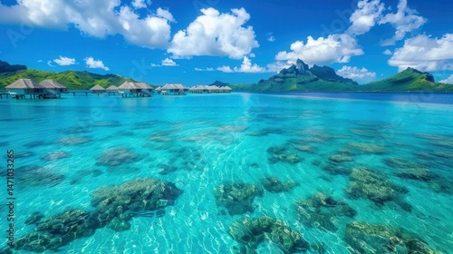 Exquisite overwater bungalows situated in a crystal clear turquoise lagoon under a bright sunny sky.