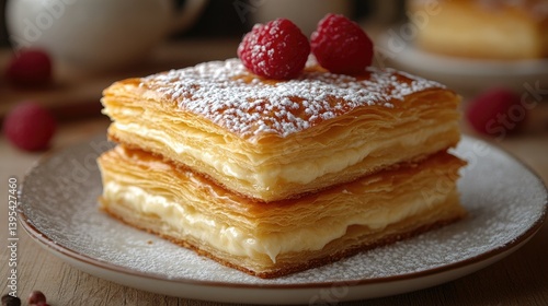Exquisite Pastry Delight: A tempting stack of layered pastry, crowned with fresh raspberries and a delicate dusting of powdered sugar, presented on a simple plate.