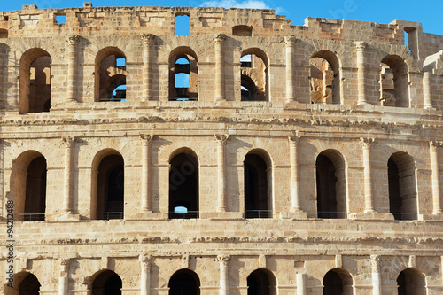 Exterior detail of the El Djem amphitheater in El Djem, Tunisia.