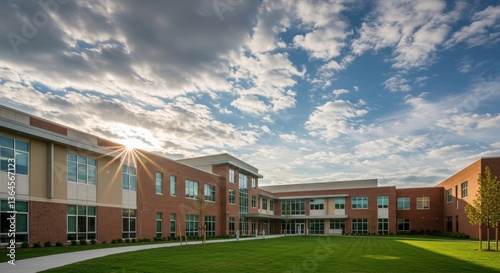 building, brick, lawn, sky, cloud, exterior, architecture, grass, window, sun, day, campus, school, tree, structure, facades, outdoors, design, estate, property, clear, perspective, modern, yard, ground, path, light, residential, establishment, with