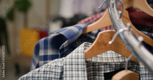 Extreme close up shot of stylish selection of shirts on hangers in high end fashion boutique showcasing trendy garments from new collection. Men shirts rotating on clothing store rack