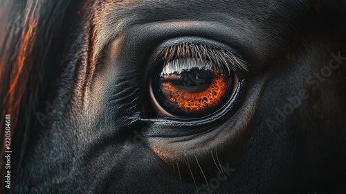 horse, eye, closeup, reflections, generative, texture, detail, fur, eyelash, gaze, pupil, equine, high-coloured, sharpened, animal, look, nature, mammal, vision, intensity, dramatic, beauty, organic, natural, deep, expression, observation, powerful, contemplative, mysterious, iris, macro, enigmatic, brown, detailed, artistry, photo, reflective, captivating, lash, aesthetic, soulful, intense, striking, wild