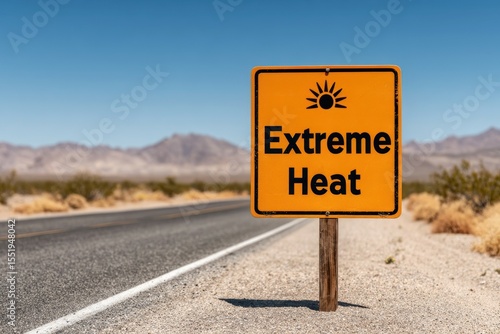 Extreme Heat Warning Concept. Warning Sign for Extreme Heat with Sun Icon Along Desert Roadway