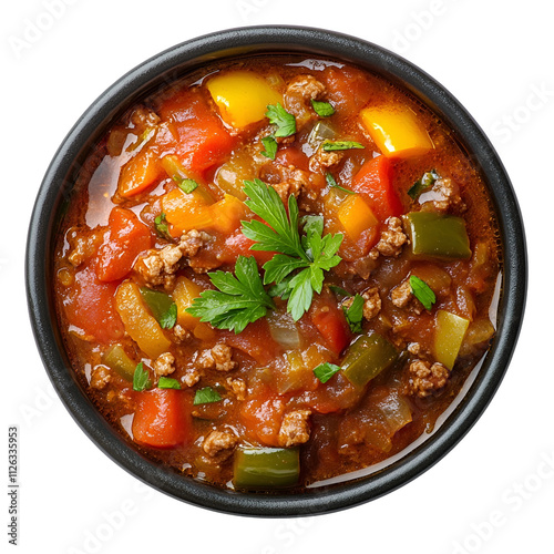 Extreme top view of hyperrealistic stuffed pepper stew in a dark ceramic bowl isolated on a white background well lit sharp focus.