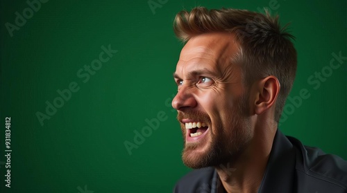 Exuberant Man Portrait: Laughing Bearded Guy with Wide Smile on Green Background