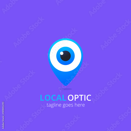 Eye logo on violet background. Vector design template. Local optic logotype. Logograms with geo pin