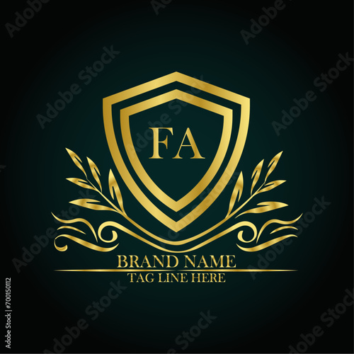 FA luxury letter logo template in gold color. Elegant gold shield icon. Modern vector Royal premium logo template vector