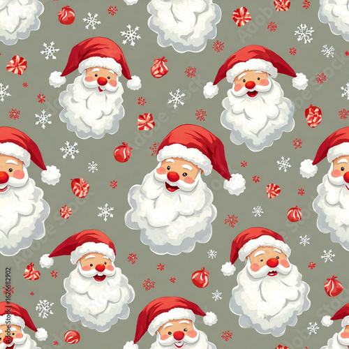 Fabric pattern, Christmas background, Santa Claus, pine tree, snowman, snow, gift box Generative AI