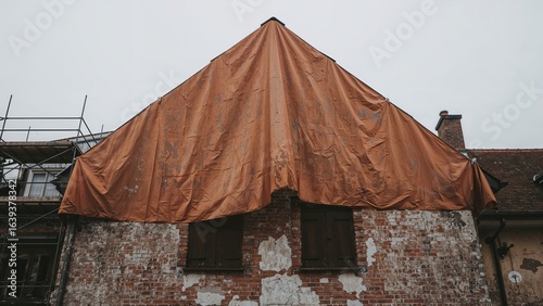 Facade of a house under construction, surrounded by scaffolding and covered in orange and white tarp