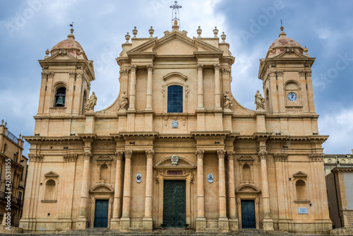 Facade of Roman Catholic cathedral in historic part of Noto city, Sicily in Italy