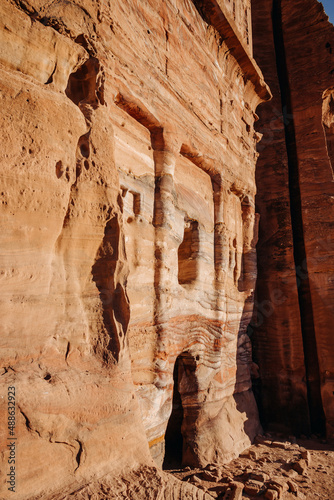 Facades in the rocks in the ancient city of Petra. Petra, Jordan