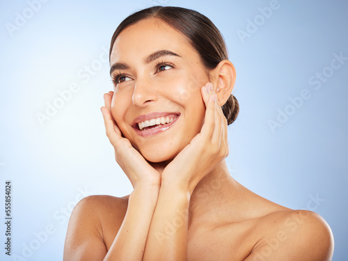 Face, beauty skincare and woman in studio isolated on a blue background. Thinking, natural makeup and cosmetics of young female model happy with spa facial treatment for healthy and glowing skin.