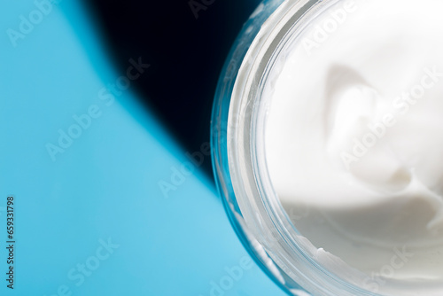 Face cream moisturiser, glass jar on blue background, skincare and cosmetic, beauty product concept.