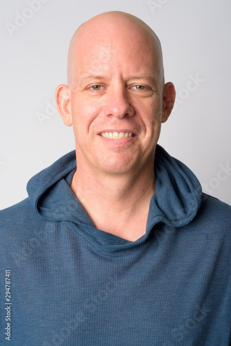 man, bald, mature, people, portrait, caucasian, 40s, male, man, guy, adult, person, baldness, alopecia, scalp, photogenic, attractive, studio, shot, isolated, white, background, hoodie, sweatshirt, sweater, casual attire, clothes, jacket, closeup, head, face, happy, happiness, smile, smiling, confident, positive, satisfaction