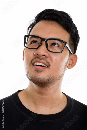 idea, pensive, thinks, thinking, thoughtful, face, people, portrait, man, asian, young, 20s, adult, background, isolated, looking, 1, person, studio, white, head, shot, eyeglass, geek, goggles, hipster, nerd, up, happiness, happy, smile, smiling