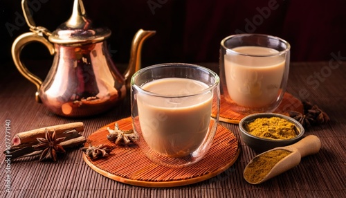 Faceted Glass Glasses on Wooden Table with Traditional Indian Drink Masala Chai
