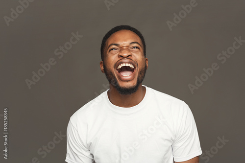 adult, african american, background, black, boy, copy space, emotional, emotion, ethnic, facial expression, guy, photogenic, leisure, lifestyle, male, man, 1, people, person, portrait, studio shot, young, casual attire, happy, home, alone, joyful, positive, smile, joy, fun, satisfied, carefree, cheer, delight, emotion, face, friendly, good mood, humor, laugh, pleasant, pleasure, tease, welcoming, witty, grey, laughing