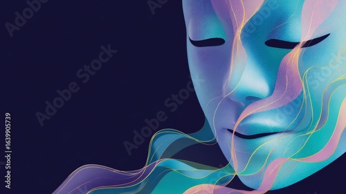 Facial sheet mask design with pastel colors and hydration lines against navy background