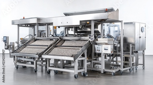 Factory floor with large industrial machines working on raw materials in an organized workspace with a white background
