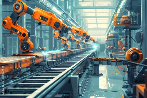 Factory scene with robotic arms efficiently handling products on a conveyor belt, A high-tech manufacturing plant with robotic arms and conveyor belts