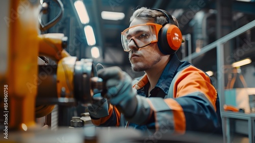 Factory Worker Operating Heavy Machinery with Protective Equipment